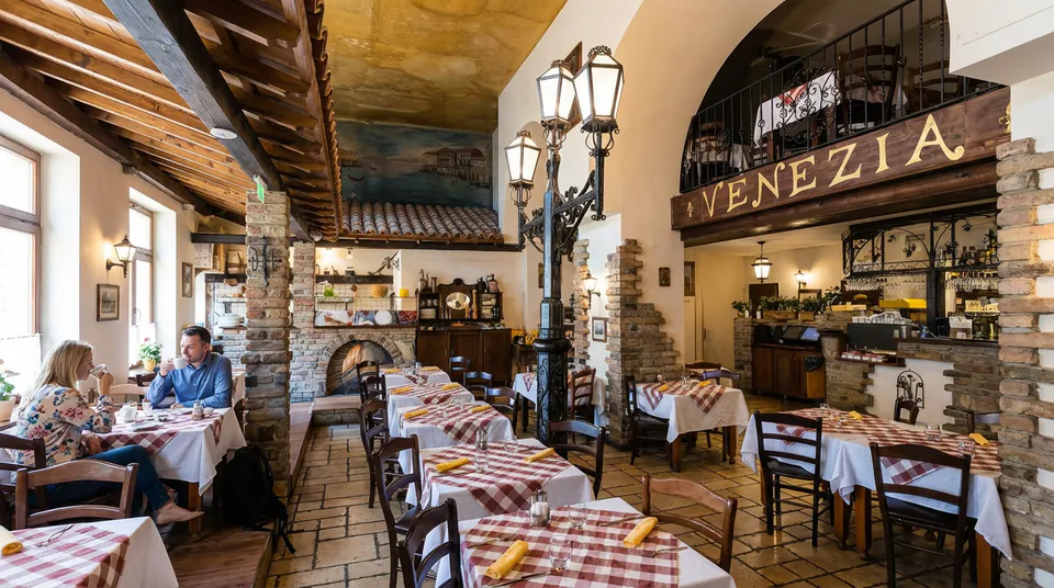 Sitting on the József körút since 1992, Trattoria Venezia is a District VIII anchor that refuses to go out of style. You won't find minimalist decor or tiny portions here. Instead, you get brick arches, terracotta floors, and the smell of wood smoke from a massive oven. It feels like a rustic tavern in the Veneto region rather than a shopfront on the Grand Boulevard. Locals have relied on this spot for three decades as the Corvin Quarter changed around it. The kitchen knows its audience. It balances Italian tradition with the kind of hearty portions that keep a Hungarian diner happy. You can watch the pizzaiolos work the wood-burning stove from your table, pulling out thin-crust pizzas with charred, blistered edges. It is a solid choice for authentic italian food budapest seekers who want a meal that feels real. The vibe is elegant but never stuffy, making it just as good for a first date as it is for a noisy family dinner.